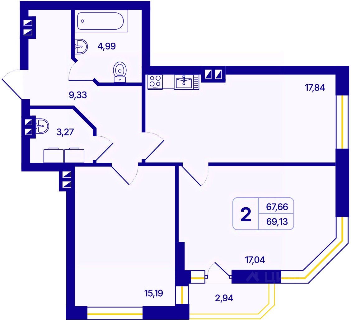 Продается двухкомнатная квартира с предчистовой отделкой в ЖК "Астон. Шесть Звезд" на 23 этаже. Общая площадь: 69.13 кв.м., жилая: 32.23 кв.м., площадь просторной кухни-столовой: 17.84 кв.м. Квартира угловая, окна oбecпeчивaют paвнoмepнoe ocвeщeниe в тeчeниe дня. В квартире одна лоджия, один совмещенный и один раздельный санузел. Высота потолков 2.65 м.