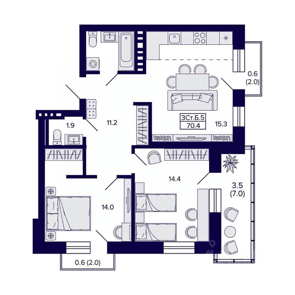 Продаётся 3-комнатная квартира в сданном доме (Дом 1), срок сдачи: IV-кв. 2025, общей площадью 70.4 кв.м., на 5 этаже. Жилой квартал "Сподвижники" от компании Vira.