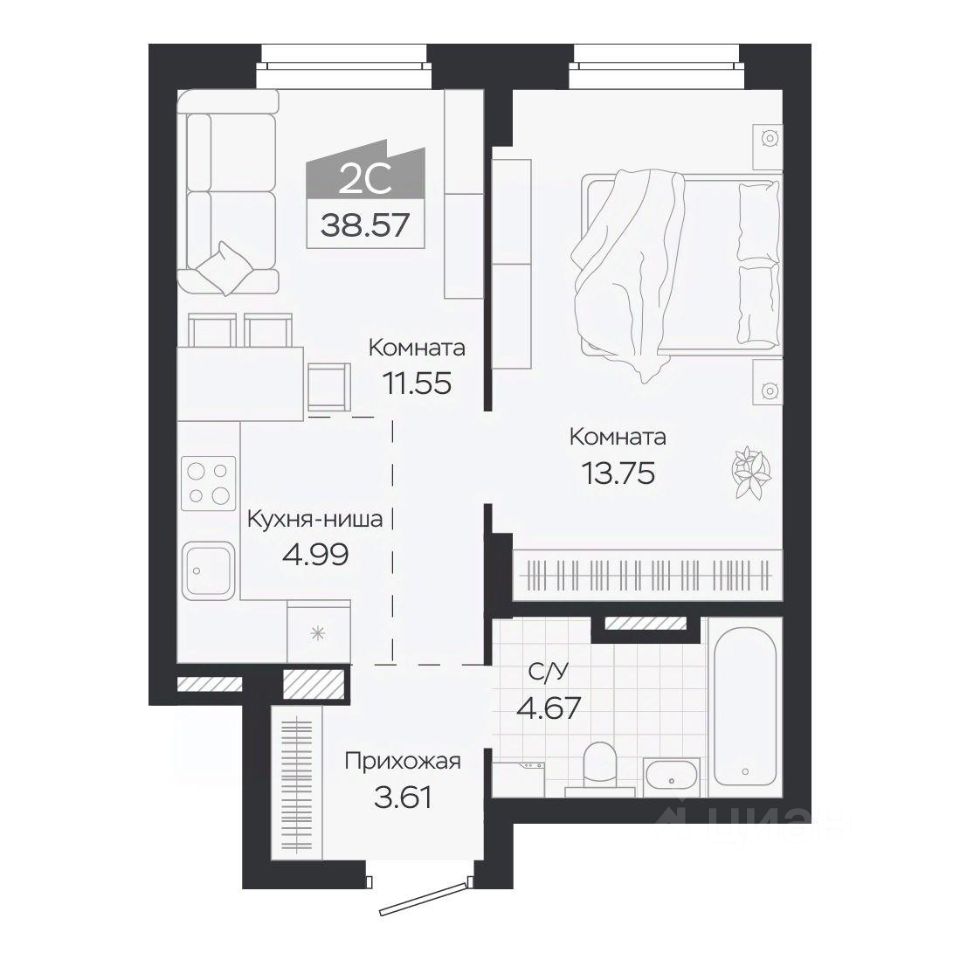 Продаётся 2-комнатная квартира в строящемся доме (Дом 3), срок сдачи: IV-кв. 2027, общей площадью 38.57 кв.м., на 7 этаже. Новый жилой комплекс "Базилик" от застройщика "Группа Мета" расположен в рп. Краснообск Новосибирской области на ул. Восточная.