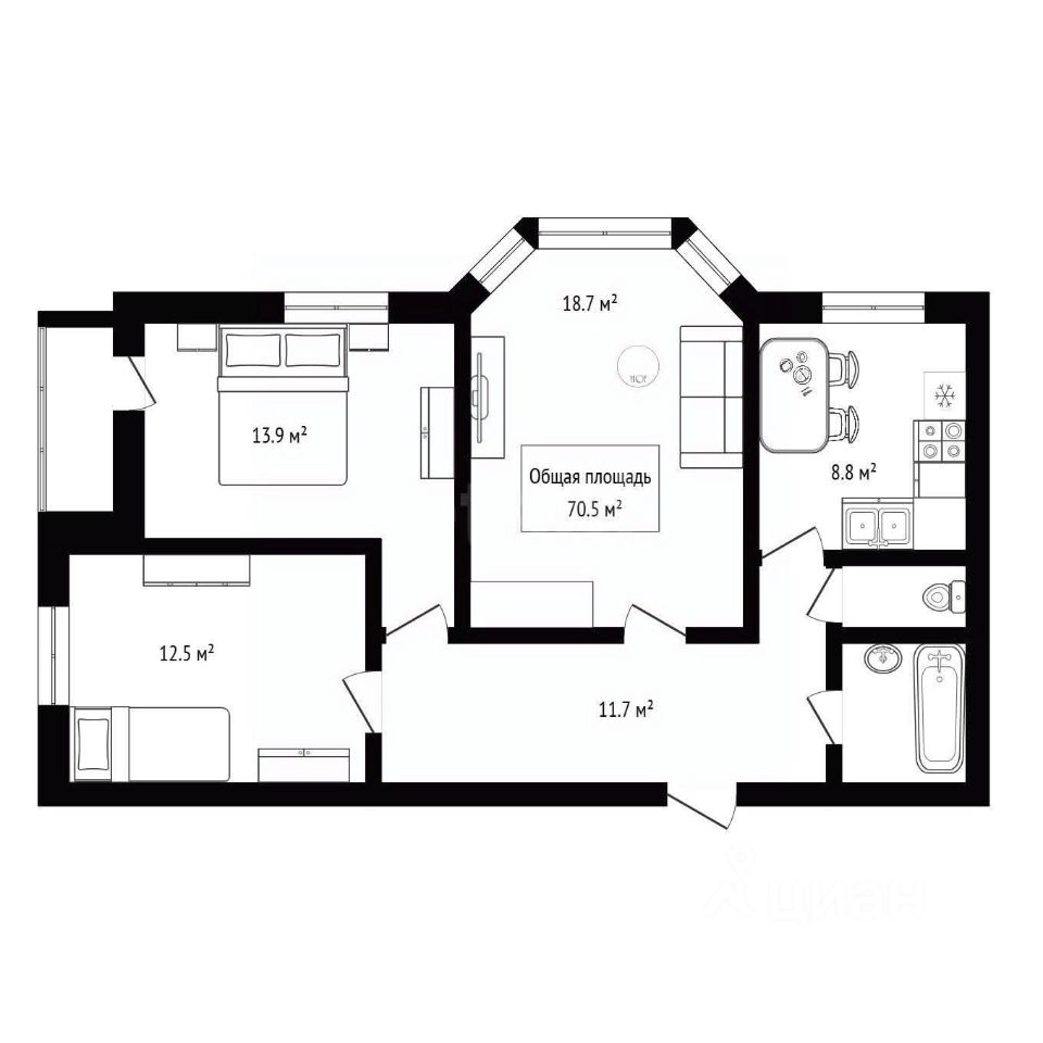 Площадь общая 70,5 кв.м.