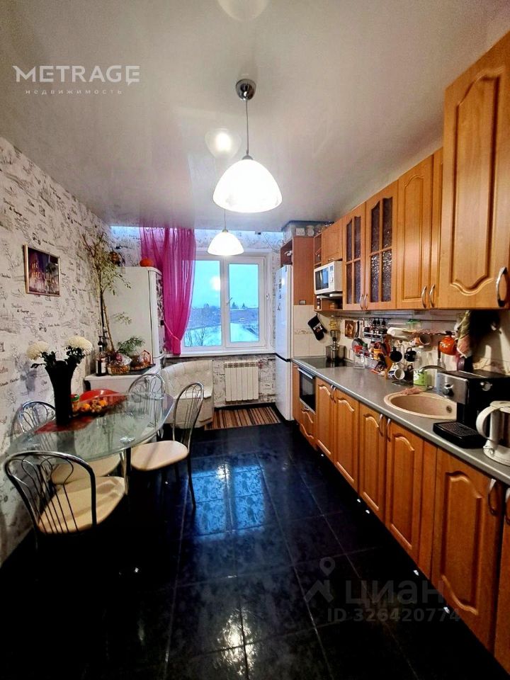 • Просторная кухня: Мечта хозяйки! Установлен качественный гарнитур в классическом стиле с большим количеством мест для хранения. На полу — практичный керамогранит темного цвета, который гармонично контрастирует со светлыми стенами.
