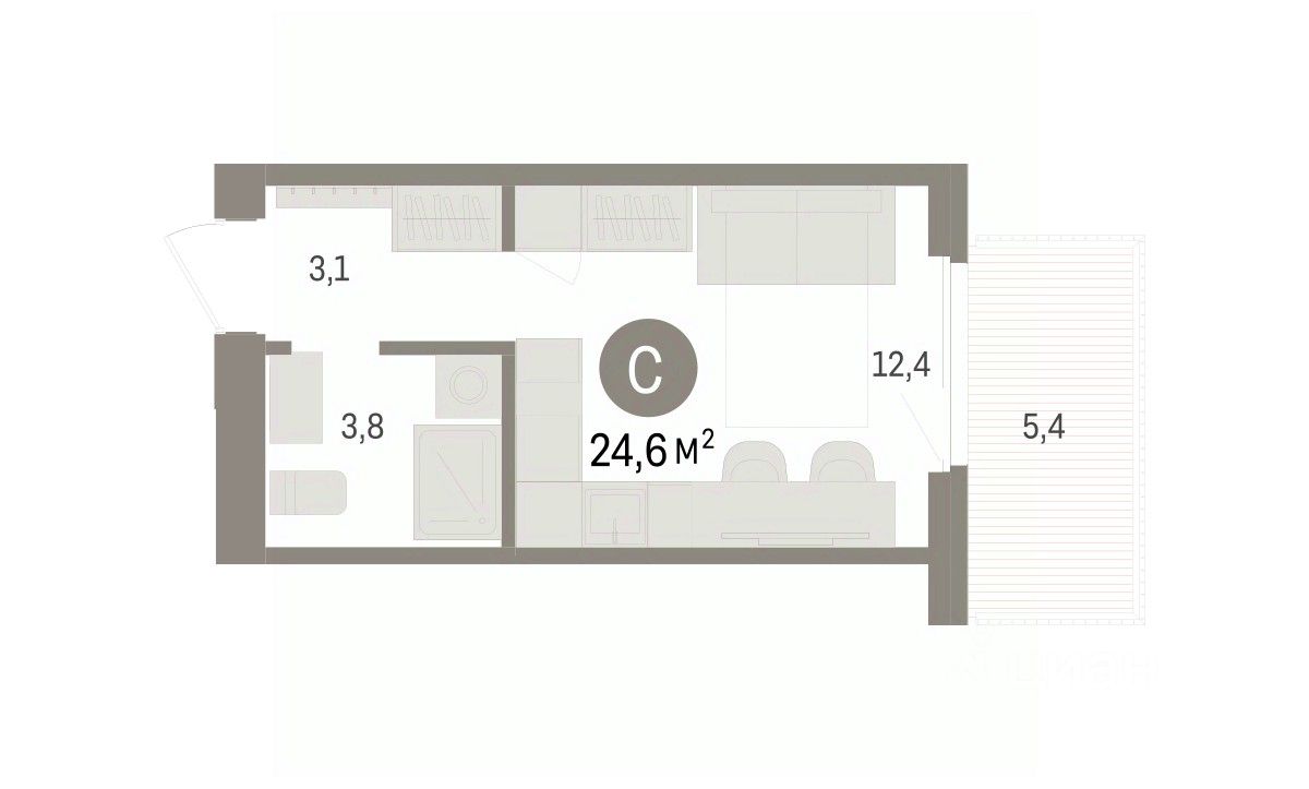 Однокомнатная студия с предчистовой отделкой в ЖК "Пшеница" на 7 этаже. Общая площадь: 24.63 кв.м., площадь гостиной 12.4 кв.м., из которых 5 кв.м. выделено под кухонную зону. Все окна выходят на одну сторону. В квартире один балкон, один совмещенный санузел. Терраса представляет собой роскошную зону отдыха, где вы на свой вкус можете создать атмосферу комфорта и уюта. Высота потолков 2.82 м.