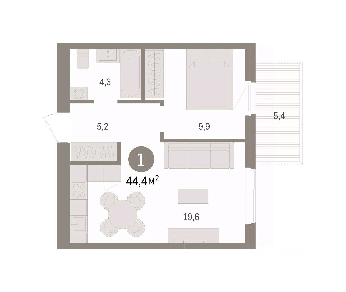 1-комн. квартира с предчистовой отделкой в ЖК "Пшеница" на 4 этаже. Общая площадь: 44.36 кв.м. Высота потолков 2.82 м.