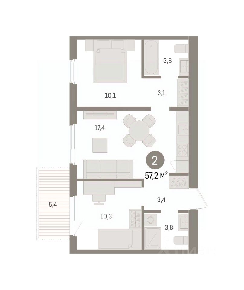 Квартира с кухней-гостиной и двумя спальнями в жилом районе "Пшеница". Особенности планировки: балкон, предчистовая отделка, разнесённые спальни.