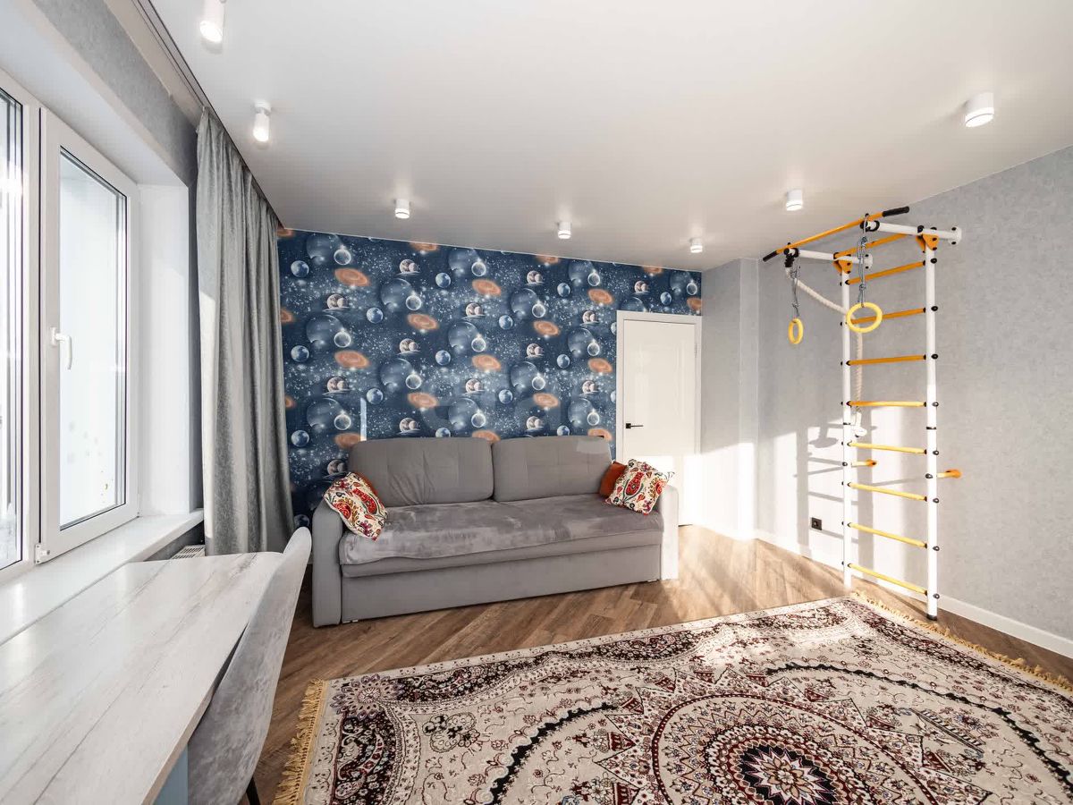 • Эргономичная планировка: большая столовая-кухня для семейных вечеров за общим столом и встречи гостей, красивая уютная спальная комната и просторная детская с окнами на две стороны, с спортивной зоной и выделенным рабочим местом