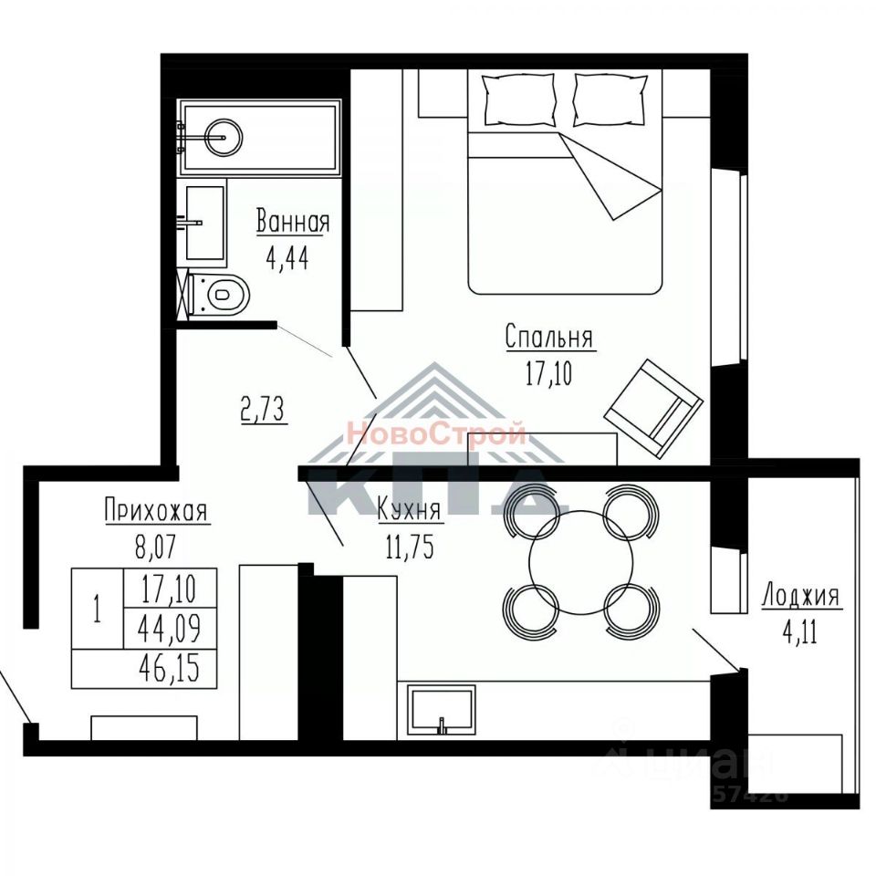 Общая площадь46,15 м²