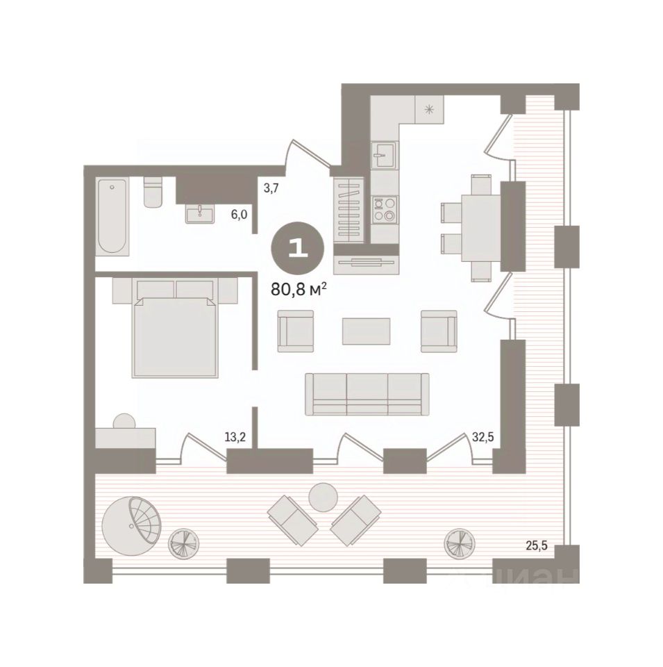 Квартира с кухней-гостиной и одной спальней в квартале "Мылзавод". Особенности планировки: предчистовая отделка, терраса на крыше.