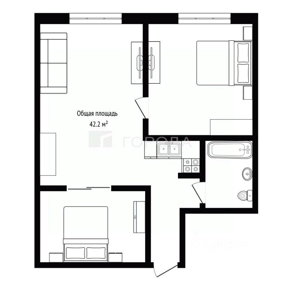 Общая площадь квартиры — 42,2 кв. м, из них жилая площадь — 28 кв. м, площадь кухни — 10 кв. м. Совмещённый санузел обеспечивает компактность и удобство.