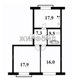Планировка квартиры: комнаты правильной формы - 2 изолированные спальни (17,9 и 16 м.кв.), просторная кухня-гостиная 17,9 м.кв., ванная комната - 5,5 м.кв. и прихожая.