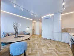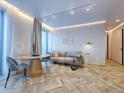 Дизайн квартиры соответствует самым высоким требованиям , сочетая в себе лаконичность светлых оттенков и гармонию организации пространства ,что создает ощущение спокойствия и уюта.