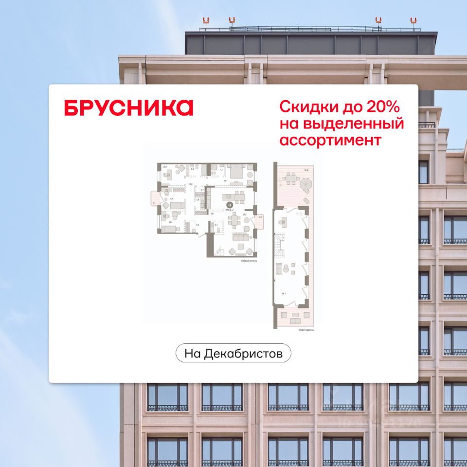 Продается 3-комн. квартира с предчистовой отделкой в Квартал На Декабристов на 9 этаже. Общая площадь: 270.8 кв.м. Высота потолков 2.81 м.