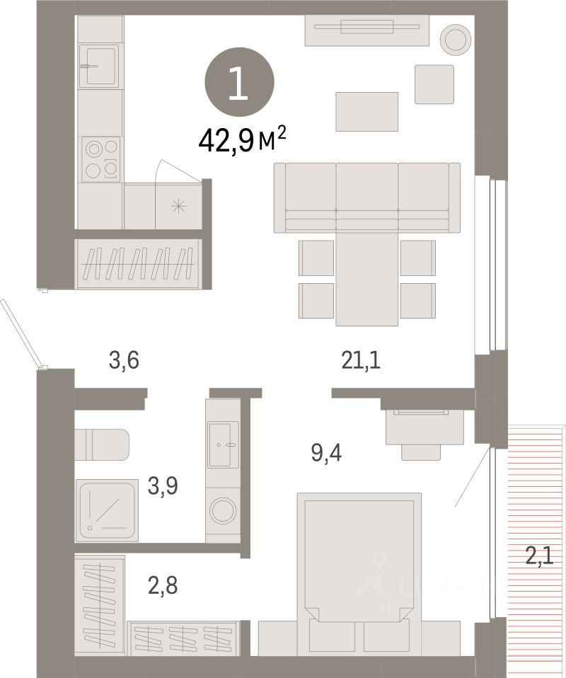 42,9 м²