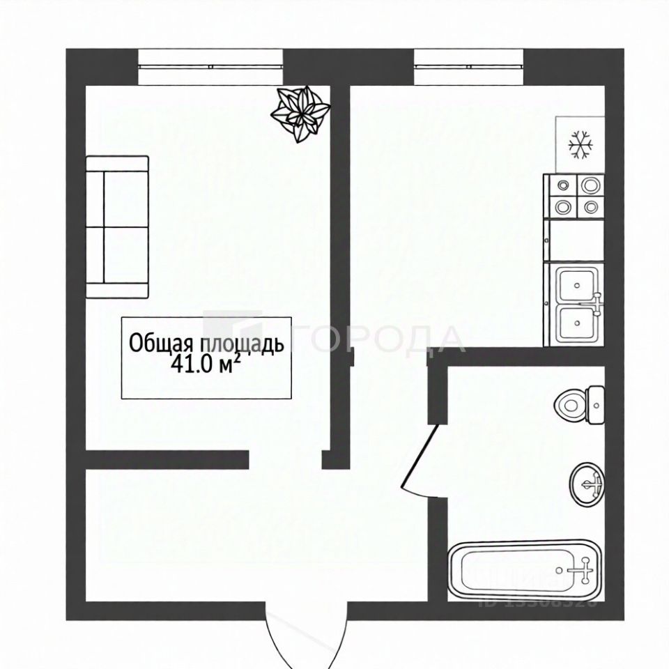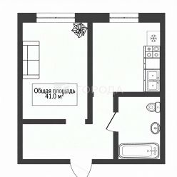 Общая площадь составляет 41 кв. м, из которых 20 кв. м — жилая площадь, 15 кв. м — кухня.