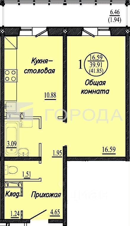 - Просторная планировка: общая площадь квартиры — 40 кв. м, жилая — 17 кв. м, площадь кухни — 11 кв. м. что