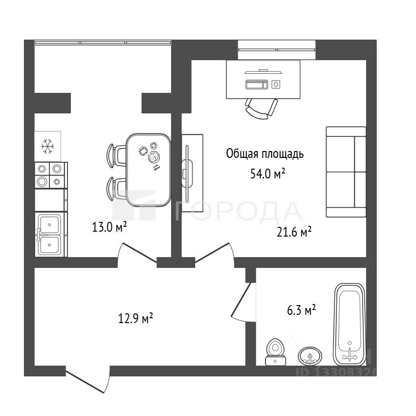 Жилая площадь — 21,6 м2, кухня — 13 м2. Идеальна для семейных ужинов и встреч с друзьями.