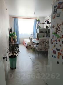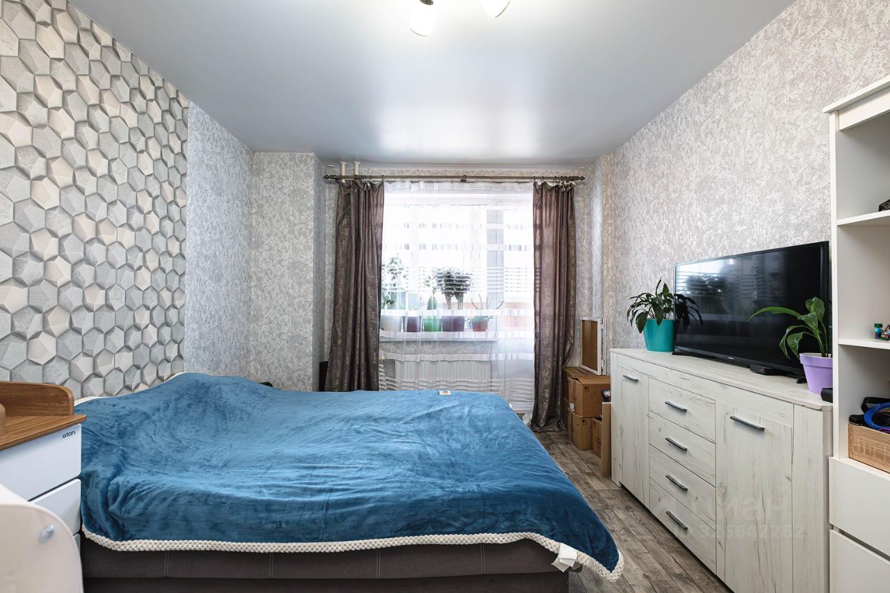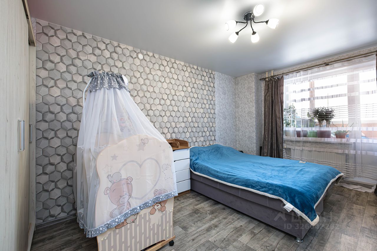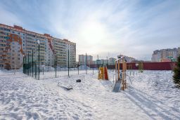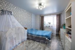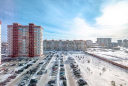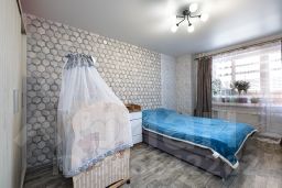 Одна комната поделена на кухонную зону и зону отдыха со спальным местом, которая отделена перегородкой. Окна выходят на парковку и детскую площадку, с окна видно школу и парковку с другой стороны. Вторая большая просторная комната с балконом, он полностью обшит вагонкой, сделаны два встроенных шкафа, которые позволяют полезно использовать место, не ставив лишнюю мебель в квартире.