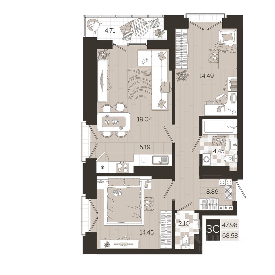 Общая площадь68,58 м²