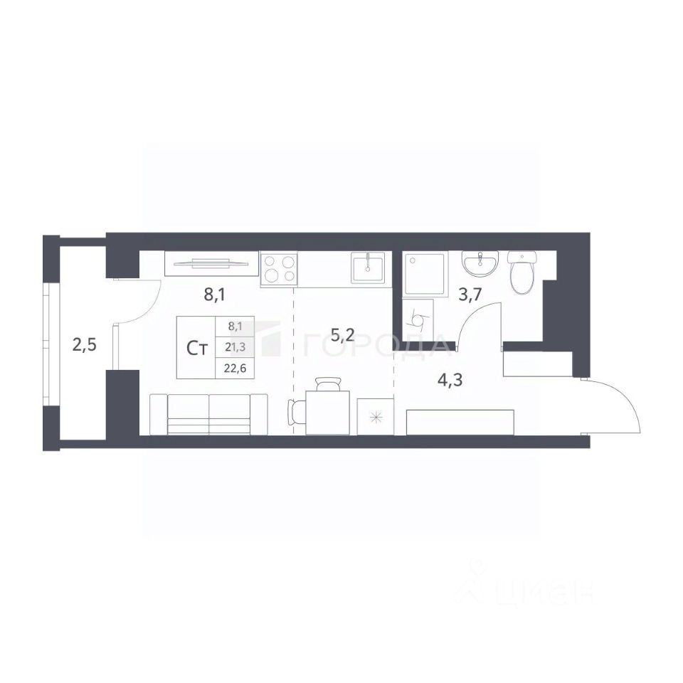 Продается квартира-студия с отделкой White box 21,3 кв.м.. Квартира расположена на 7 этаже 25 этажного монолитно-кирпичного дома в клубном комплексе "Новаторы" от группы компаний "Поляков".