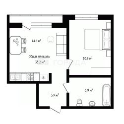 Квартира расположена в посёлке Каинская Заимка по адресу: улица Серебряное Озеро, 12. Это современный кирпичный дом 2023 года постройки. Квартира находится на 5 этаже из 8, окна выходят на улицу. Общая площадь — 35,2 кв. м, из них жилая площадь — 10,8 кв. м, площадь кухни — 14,6 кв. м. Есть совмещённый санузел. Квартира угловая, без отделки, что даёт возможность сделать ремонт по своему вкусу.