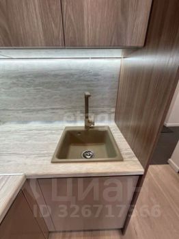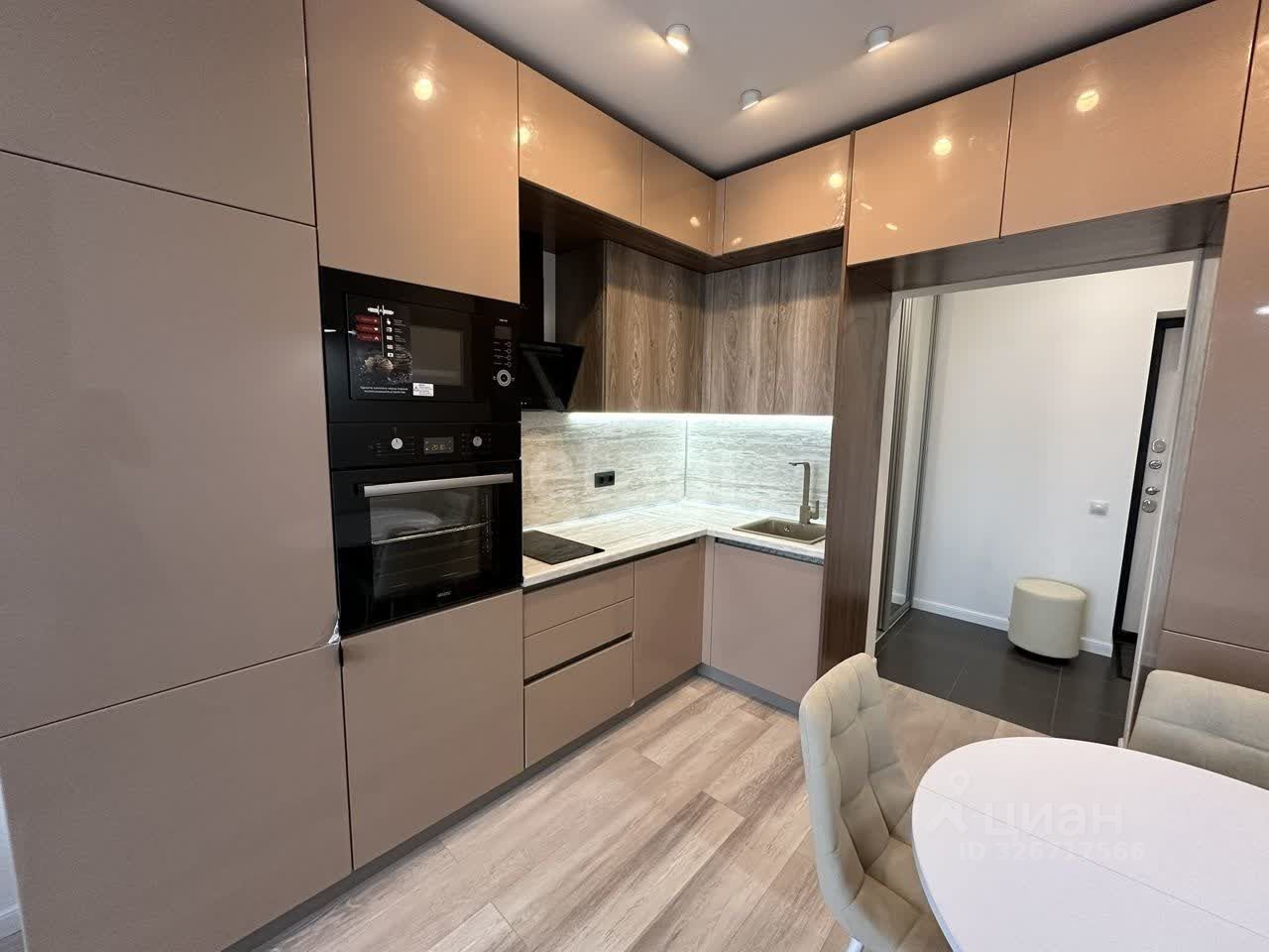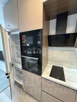 В кухне-гостиной расположен встроенный гарнитур с большим количеством шкафов, продуманный до мелочей. Микроволновая печь и духовой шкаф встроены в гарнитур. Керамическая плита с вытяжкой в едином стиле. Также встроен холодильник в гарнитур.