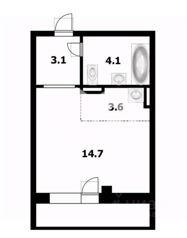 Общая площадь: 24,4 м² (жилая 14,2 м²).