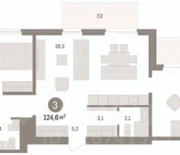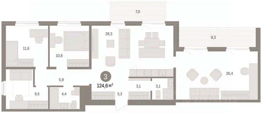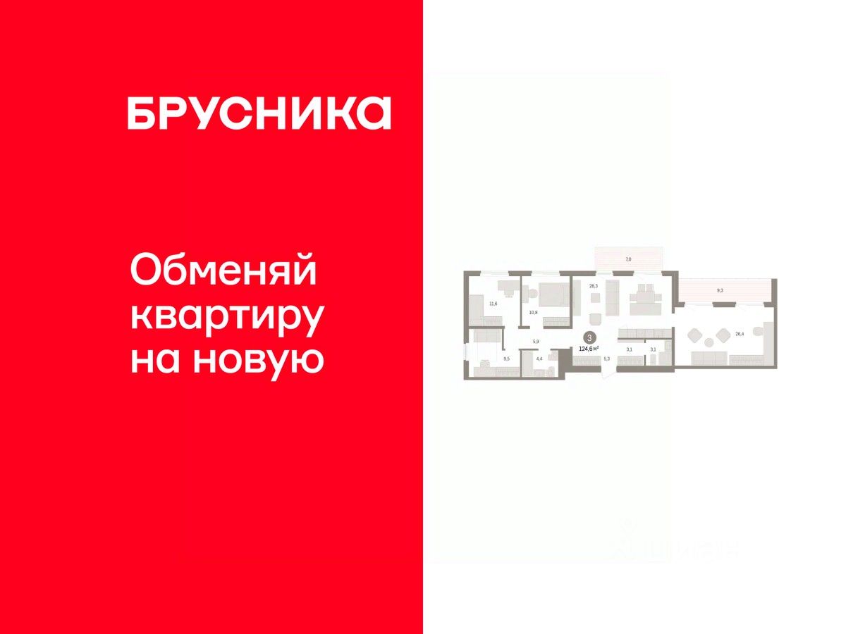 3-комн. квартира от застройщика с предчистовой отделкой в ЖК "Пшеница" на 7 этаже. Общая площадь: 124.61 кв.м. Высота потолков 2.82 м.