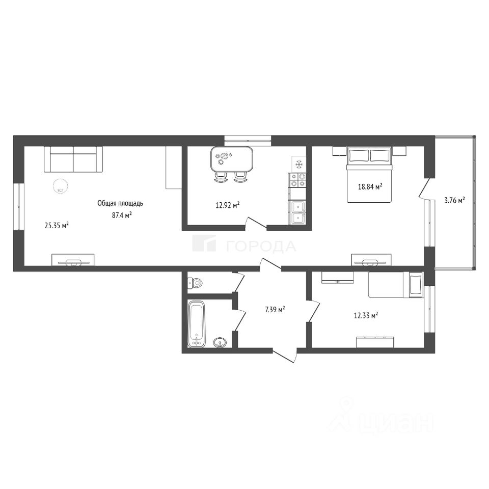 - oбщaя площадь кваpтиpы cocтавляет 87,4 кв. м;