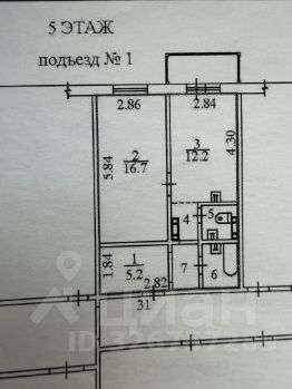 Продаётся 1-комнатная квартира 42,5 м² на 5 этаже