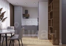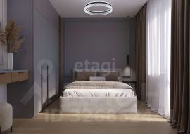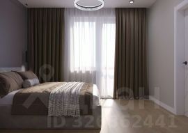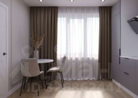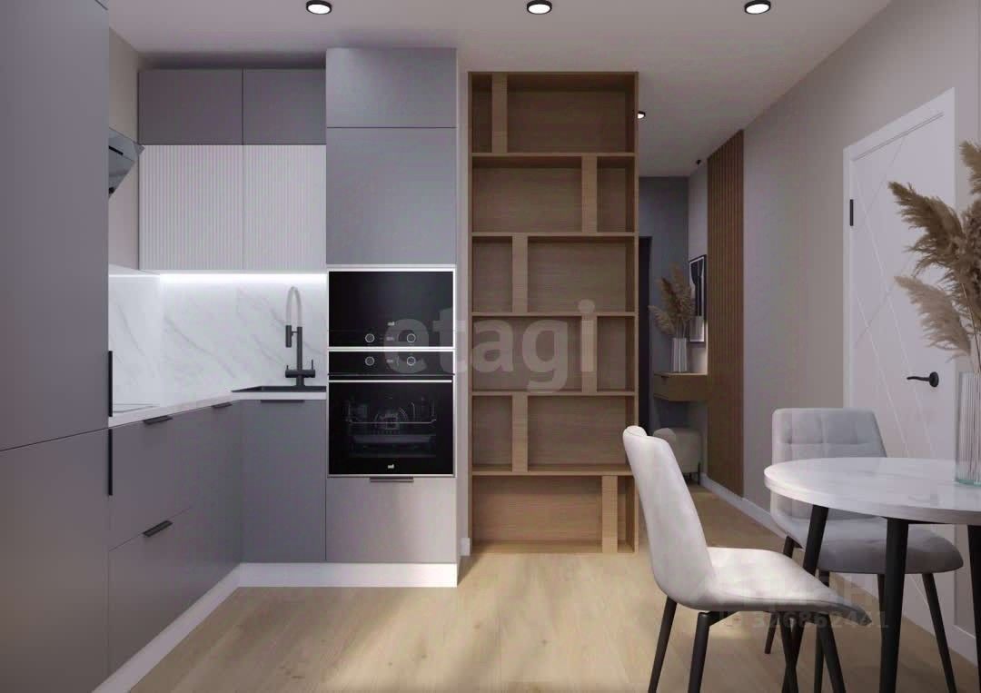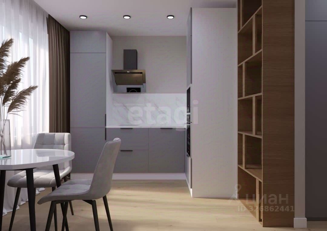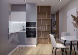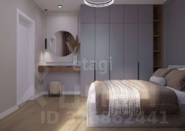 Кухня оснащена современным кухонным гарнитуром со встроенной техникой, варочная панель и духовой шкаф, встроенный холодильник, посудомоечная машина, вытяжка, встроенная микроволновая печь, обеденный стол и два стула, шторы и тюль. В спальне остается кровать с комфортным матрасом, встроенный шкаф для одежды, прикроватная тумба, шторы и тюль, навесная тумба и пуфик к нему, зеркало.