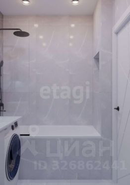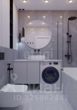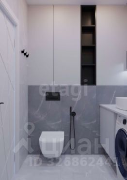 В ванной комнате система хранения, зеркало, стиральная машинка. В коридоре шкаф в полный рост, подвесная полочка, удобный пуф.