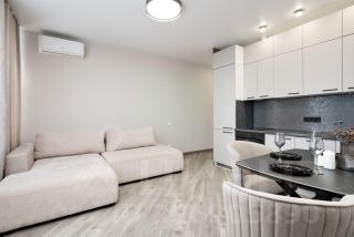 - Полный комплект техники: Кондиционер, варочная поверхность, встроенный холодильник с авторазморозкой, посудомоечная машина, печь, вытяжка