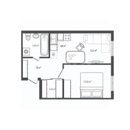 Общая площадь 48,9 м., площадь зоны кухни 4.8 м. Совмещенный санузел 5,3 м. Предусмотрена гардеробная 4.1 м.