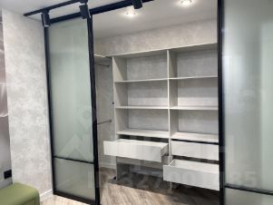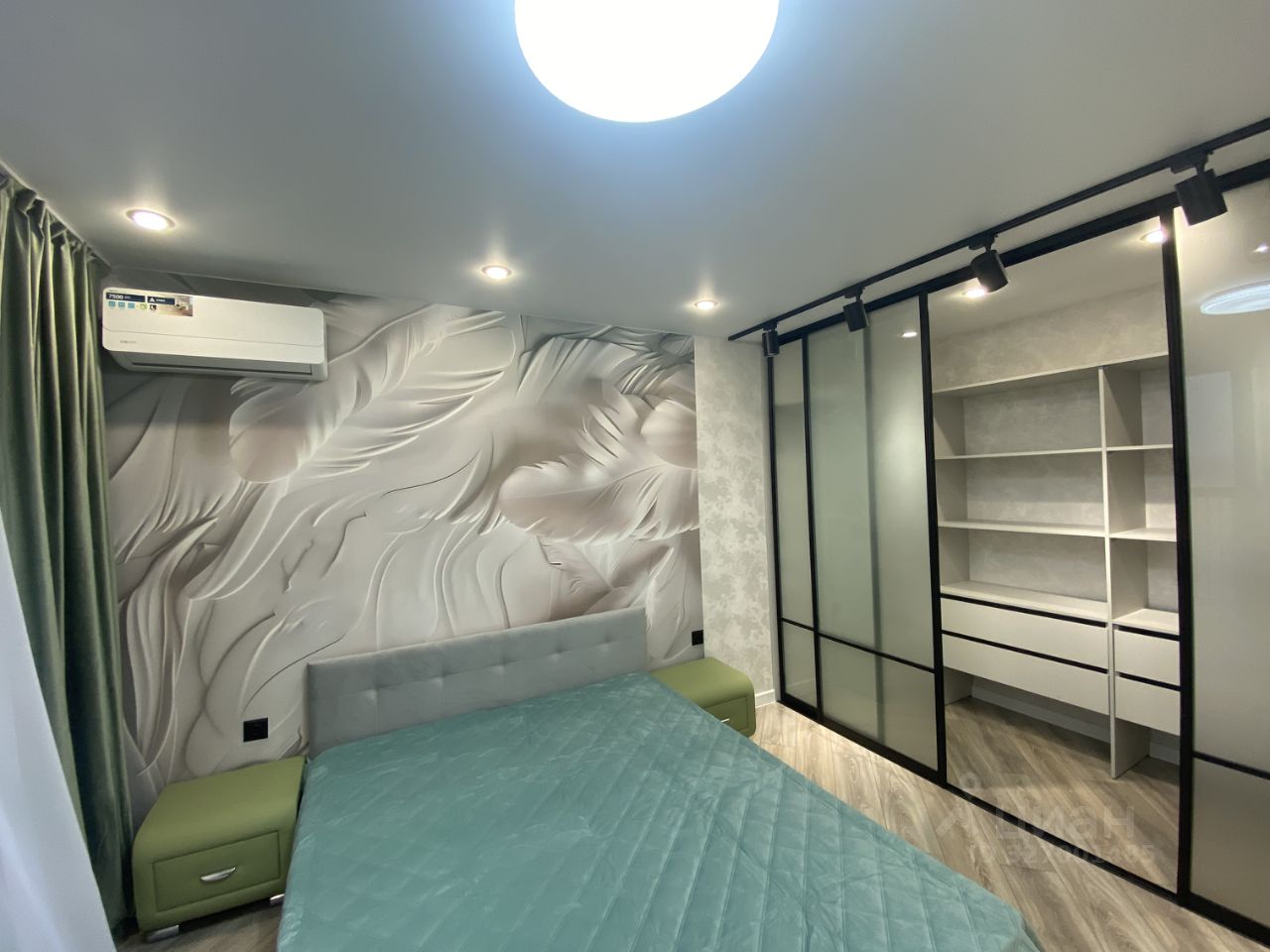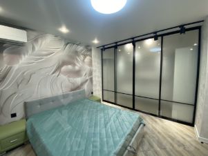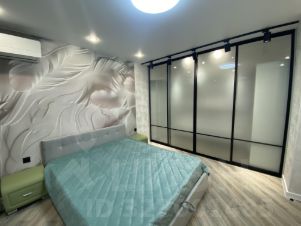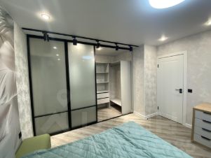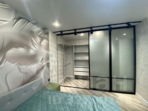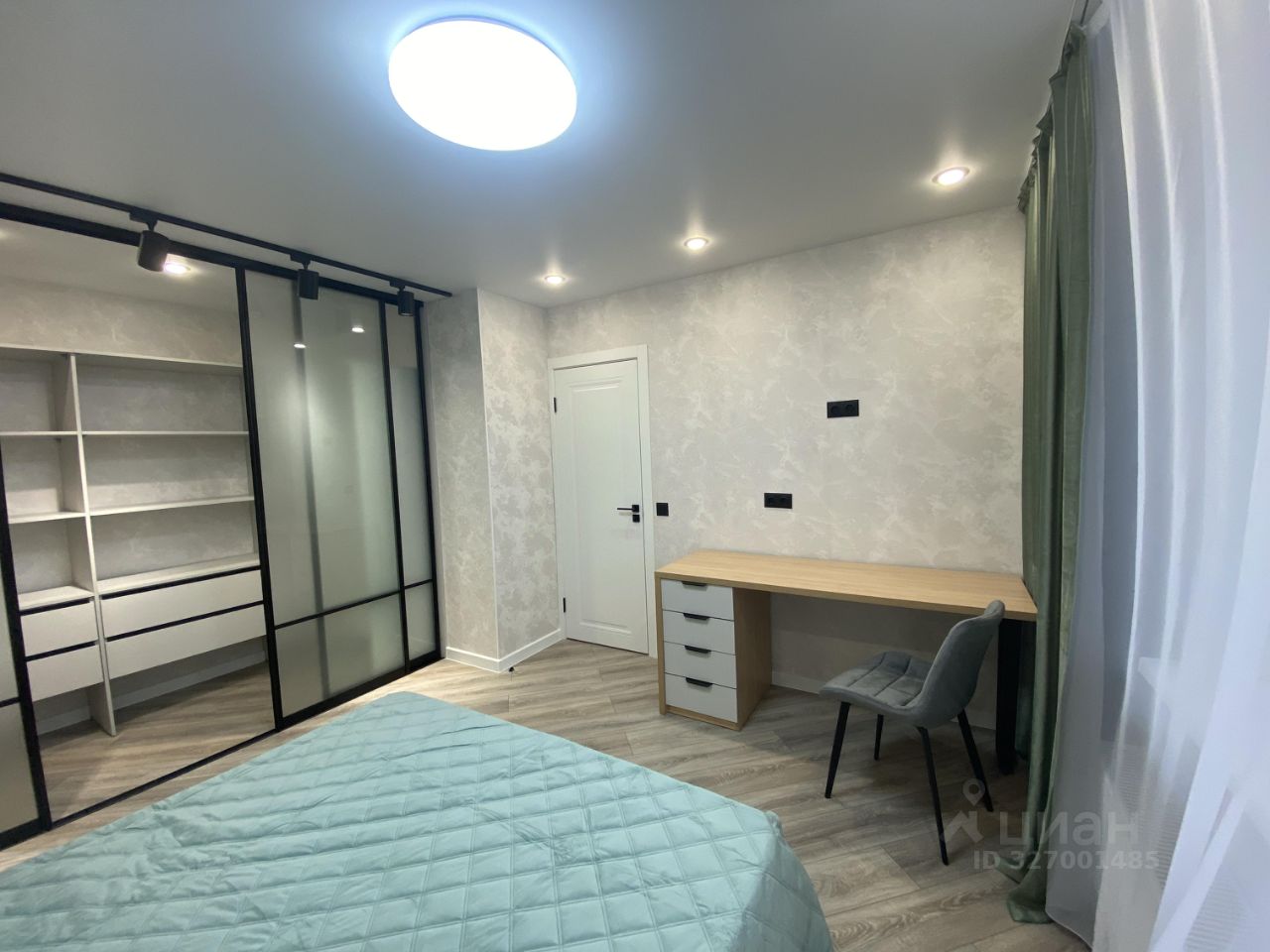 Спальная комната оснащена всей необходимой мебелью. Кровать с матрасом и подушками, отдельная рабочая зона, большая гардеробная.