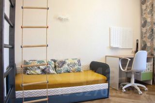 Во второй спальне: горчичного цвета двухместный диван и небольшое хранение для детских игрушек/вещей;