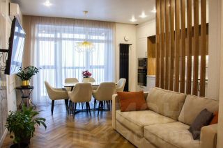 Кухня-гостиная достаточно просторная для семейного кино-вечера. Предусмотрена вся необходимая бытовая техника: варочная плита, холодильник, чайник, микроволновка, духовой шкаф, посудомоечная машина, вытяжка;В первом санузле: стиральная машина, душ, унитаз и раковина;