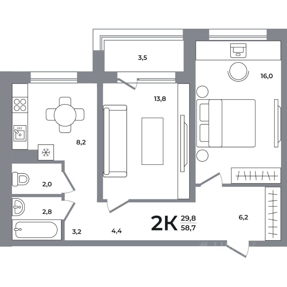 Продаётся 2-комнатная квартира в строящемся доме (Дом 1), срок сдачи: I-кв. 2026, общей площадью 58.4 кв.м., на 4 этаже. Новый жилой дом от компании "Агросервис" расположен в Кировском районе Новосибирска в границах улиц Беловежская - Сибиряков-Гвардейцев.
