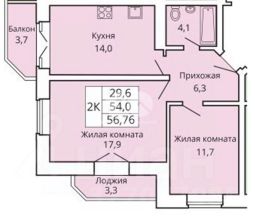Двухкомнатная квартира, площадь без лоджии и балкона составляет 53,9 м2.