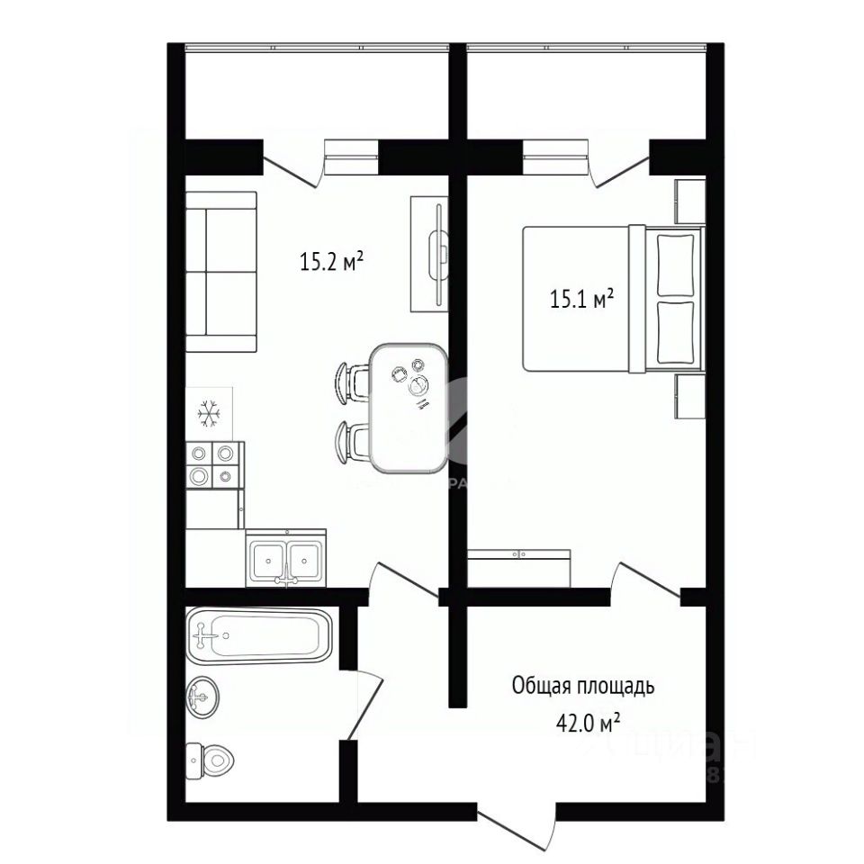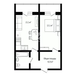 Общая площадь — 42 кв. м., две изолированные комнаты.