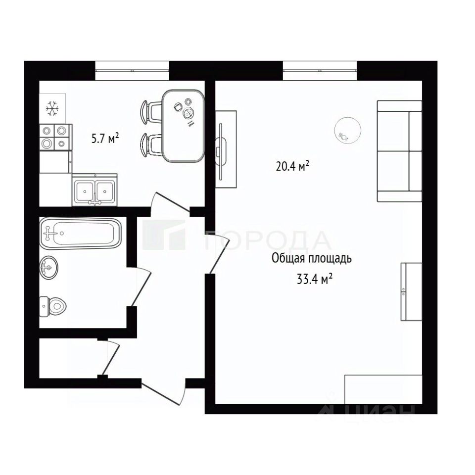 Общая площадь квартиры составляет 33,4 кв. м, из которых 20,4 кв. м — жилая площадь, а 5,7 кв. м — кухня.