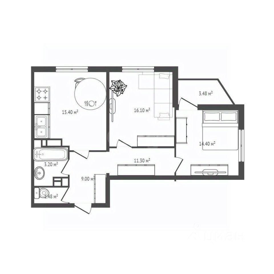 Квартира с просторной кухней-гостиной 15.4 м, и двумя комнатами 16.5 и 14.5 м.