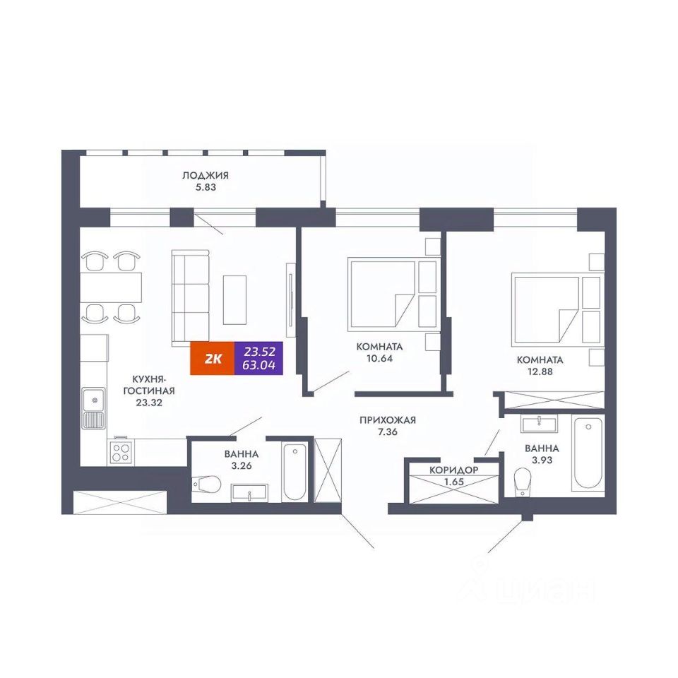 Общая площадь63,04 м²