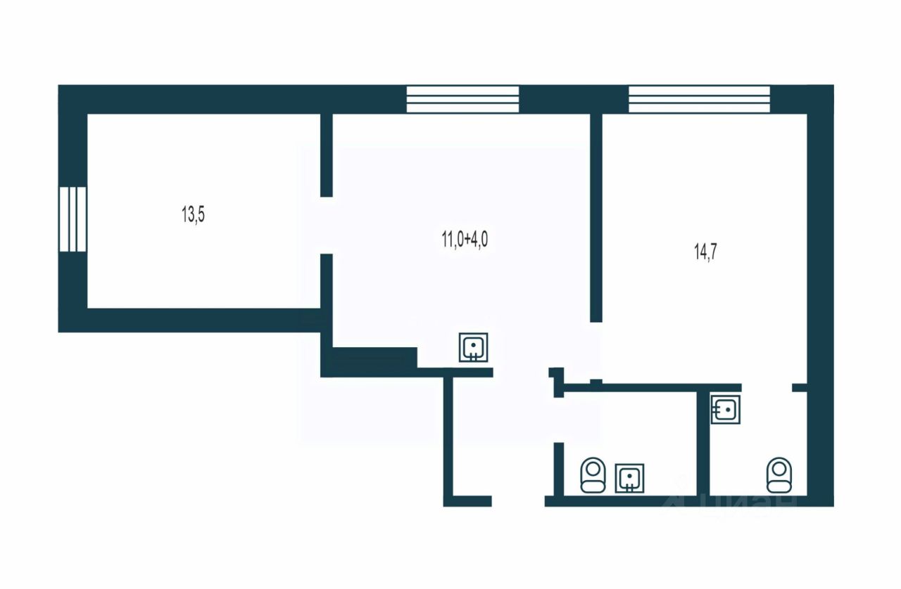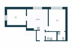 Общая площадь квартиры — 53 кв. м, две спальни ( в одной санузел) и просторная гостиная столовая.