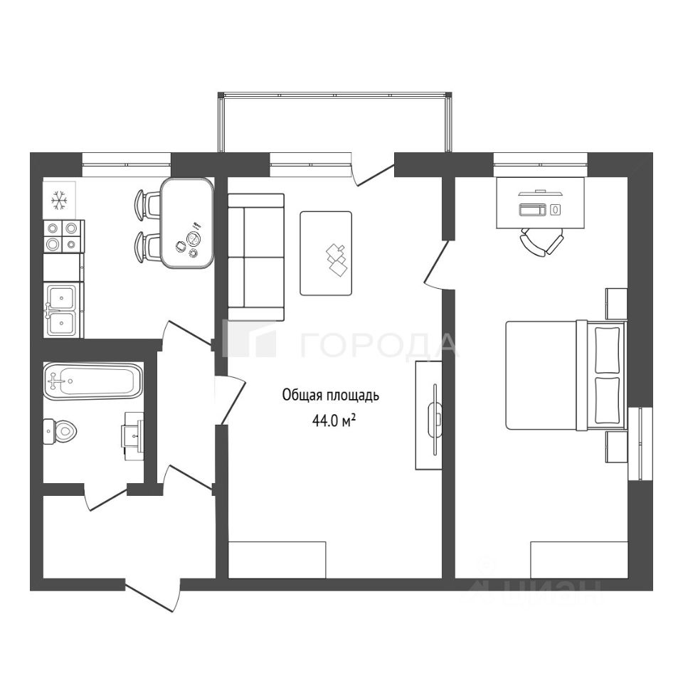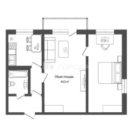 Эта двухкомнатная квартира общей площадью 44 кв. м на пятом этаже. Жилая площадь составляет 30 кв. м, а площадь кухни — 6 кв. м. Высота потолков 2,5 метра создаёт ощущение простора.