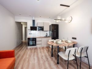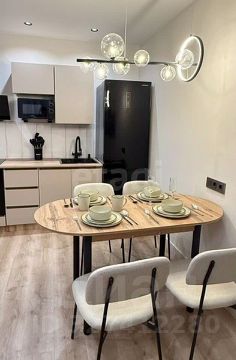 Просторная кухня площадью 15м² оборудована всей необходимой техникой: холодильник, духовой шкаф, вытяжка, варочная панель. Раскладывающийся диван, телевизор, стол со стульями и даже посуда так же вся остается в квартире. В ванной установлена стиральная машина и водонагреватель на 30л.