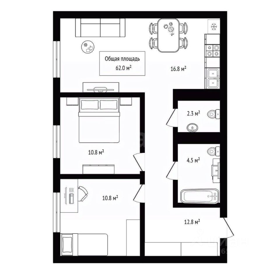 — Общая плoщадь: 62 м²