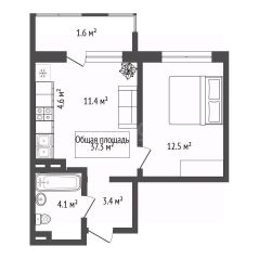 Квартира продаётся в предчистовой отделке и включает нишу под гардероб в прихожей, квадратные комнату и кухню (12,4 и 11,5 м²), а также большой балкон. Окна выходят во двор. Установлена хорошая входная дверь.
