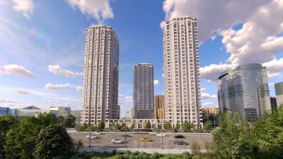 Комплекс представляет замкнутую постройку из трех башен. Две башни 30 этажей и одна 25-этажная расположены в шахматном порядке, что позволяет создать парадную симметрию и в то же время разреженную, "проницаемую" структуру застройки всего комплекса. При этом башни расставлены с оптимальными паузами, чтобы каждому метру доставалось максимум солнца. Архитектурно-художественный образ выполнен в стиле модернизма в современном прочтении. В отделке фасадов использован облицовочный кирпич белого цвета разных тонов. Комплекс строится по технологии монолитный каркас с кирпичным заполнением, облицовка декоративным керамическим белым кирпичом. А кладка наружной версты уступами, наличие ниш, поясов и эркеров добавляет фасадам пластики. В то же время комплекс зданий смотрится цельным и единым благодаря общей фактуре.