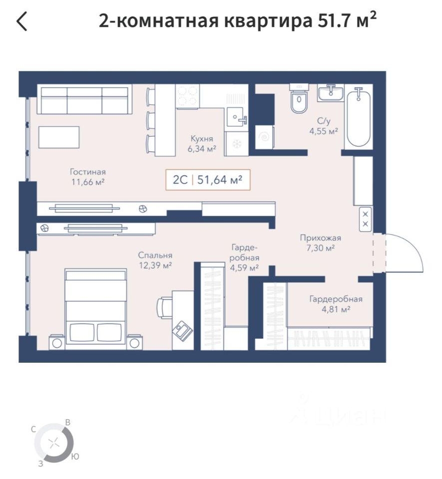 * Общая площадь — 51,64 м²