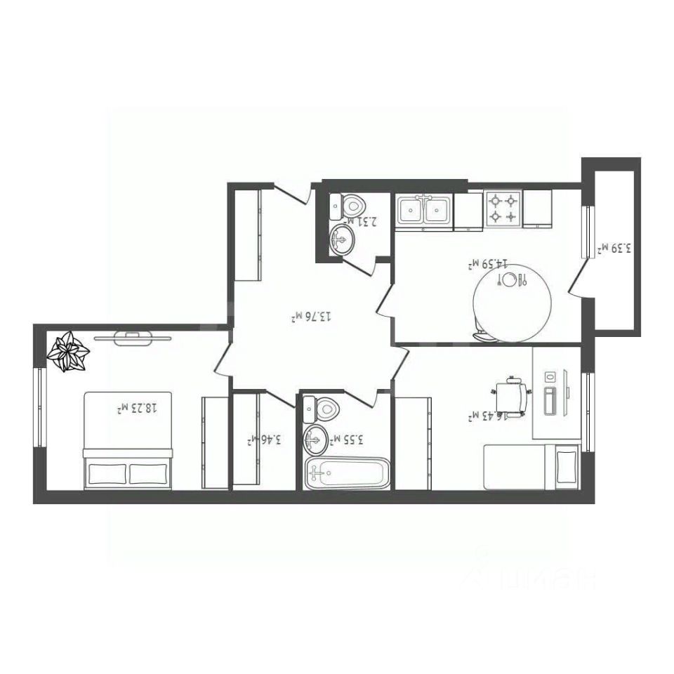 — Удобная современная планировка: большая кухня-гостиная + отдельные комнаты, раздельный санузел.