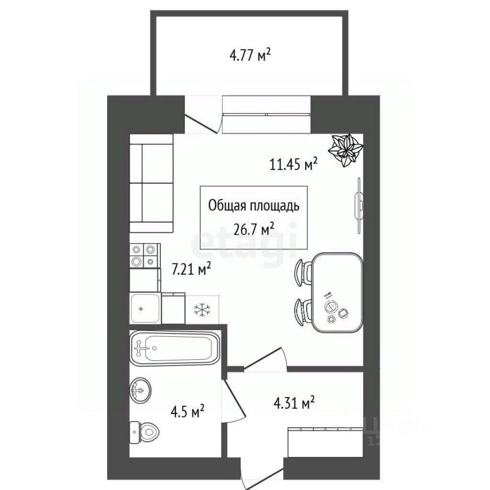 Планировка квартиры включает вместительную прихожую с гардеробным шкафом (4,3 м²), квадратную большую комнату (18,7 м²), в которой спокойно разместились зона кухни и жилая часть; а так же уютный балкон (4,7 м²), который представляет собой уютное местечко для отдыха.